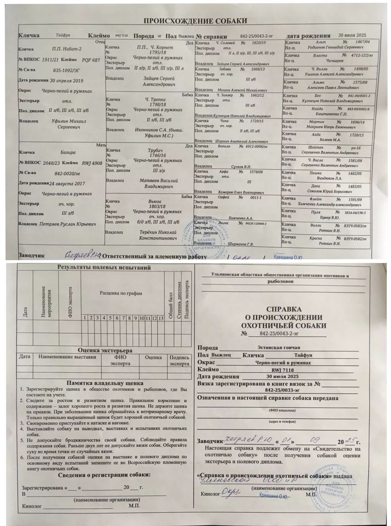 Щенки Эстонской Гончей, плановая вязка, из под рабочих родителей записанных во Всероссийскую Племенную Книгу Охотничьих Собак (ВПКОС). 2 выжлеца, 5 выжловок. Рождены 30.07.25. Папа - Полевой Победитель Набат-2: один диплом 2 степени заяц беляк; два диплома 3 степени заяц беляк, Голос 6-2-4. Мама имеет полевой диплом 3 ст по зайцу беляку, отлично работает и по лисе, и по русаку, голос 6-2-4. Щенки обработаны от паразитов, привиты, есть медпаспорта. Прикус у всех правильный. На фото документ (так называемый "щенячка") подтверждает происхождение щенков и регистрацию вязки в РОСОХОТРЫБОЛОВСОЮЗе. По порядку на фотках: Байкал, Тайфун, Луна, Багира, Гроза, Искра, Айна. Цена договорная!
